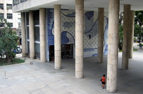 A watershed landmark in brazilian modern architecture, erected between 1937 and 1945, designated to be the Health and Education Ministry. It is the result of the architects group led by Lucio Costa and participations from Afonso Eduardo Reicly, Carlos Leão, Jorge Moreira, Ernani Vasconcellos and Oscar Niemeyer. The project reached to stick to the architectonic rationalism from Le Corbusier: pilotis use, free floor plans, a terrace garden, clean façade and horizontal windows. It’s 16 floors are made with bold materials: iron and concrete, lioz marble, English clinkers mixed yellow marble. The gardens were projected by Burle Marx with a wall tile panel made by Cândido Portinari.