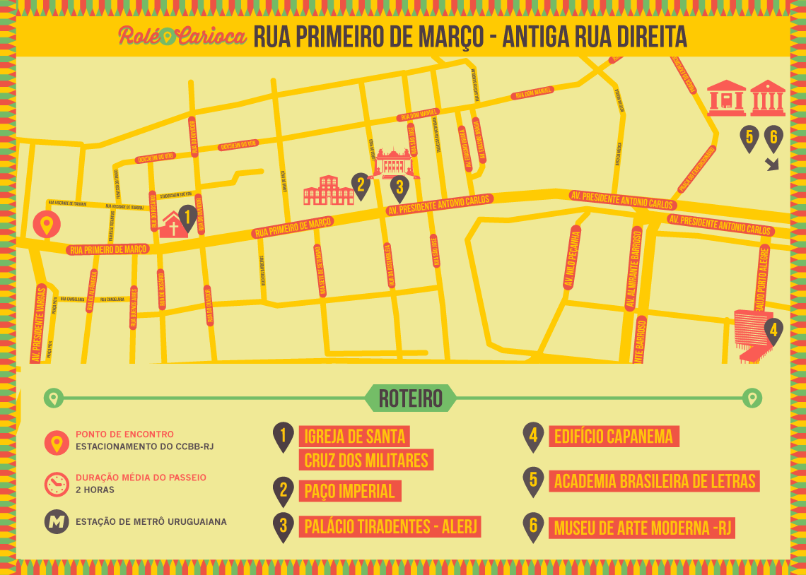 The path of this Rolé Carioca will take show us the most representative street from colonial Rio, once named Rua Direita (Straight Street). Historical evidence tells that this used to be the way made by the temiminós indigenes long before the Portuguese colonizers. When the city seat established in Castelo during the 16th century it increased the route circulation, which would receive the first constructions: the religious Carmelite order, a wharf and the Santa Cruz fortress. Around the 17th century the erection of landlord mansions, as those owned by Correias de Sá, Benevides, and Teles de Menezes (of which derives the Teles Arch), gave a new use of the surroundings. Other buildings were made in the new colonial capital: the customhouse (now Casa França-Brasil), the Casa dos Contos and Governors House which later would become the Imperial Palace.